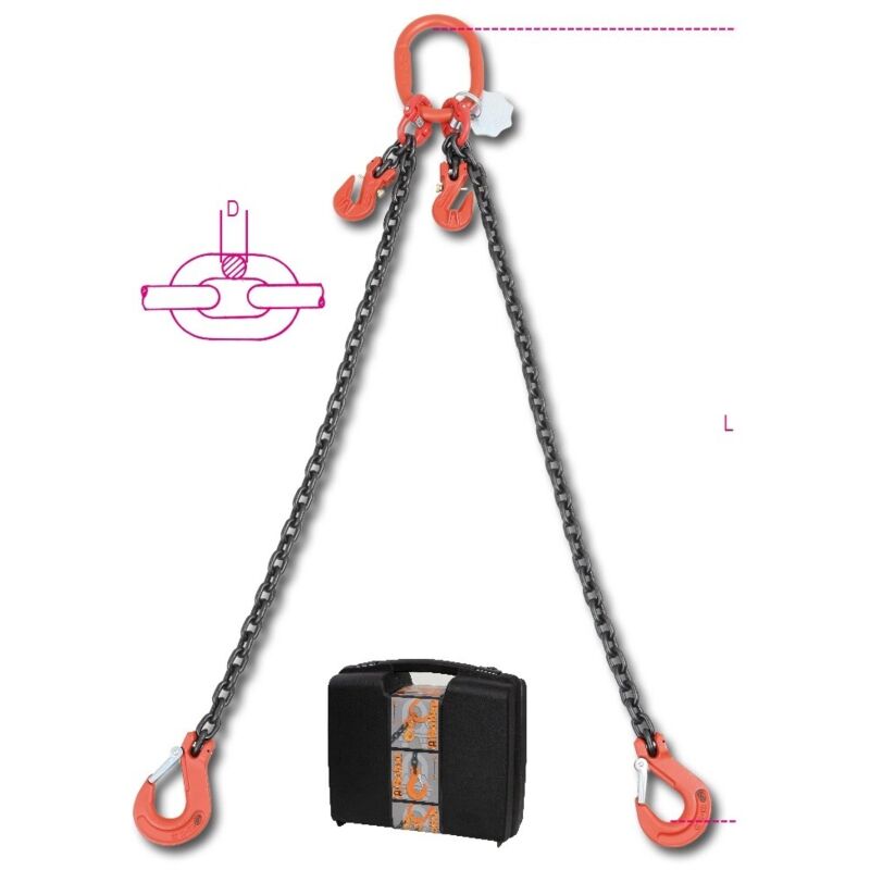 Pendentiper sollevamento con ganci accorciatori catena a2 bracci, in valigetta Tipologia: Pendente Utilizzo: Sollevamento Bracci: 2 Ganci accorciatori: 2 Portata: 2,80 t Lunghezza: 1/4 m Diametro catena: 8 mm Coefficiente di sicurezza: 4 Certificazione: Uni en 818-4 Dichiarazione di conformità: Ce Valigetta: Si