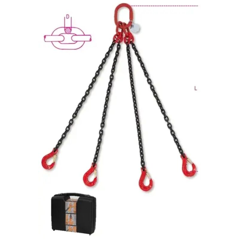 Pendenti per sollevamento catena a 4 bracci in valigetta Tipologia: Pendente Utilizzo: Sollevamento Bracci: 4 Portata: 4,25 t Lunghezza: 1/4 m Diametro catena: 8 mm Coefficiente di sicurezza: 4 Certificazione: Uni en 818-4 Dichiarazione di conformità: Ce Valigetta: Si