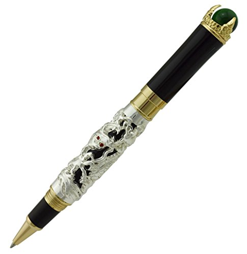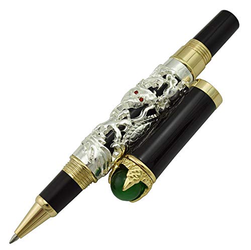 Penna Roller Jinhao Dragon, Drago d'argento che gioca a botte di perle, Gioielli verdi sulla parte superiore con piccola borsa per penne