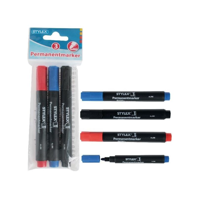 3 pennarelli indelebili di Stylex nei colori rosso, blu e nero