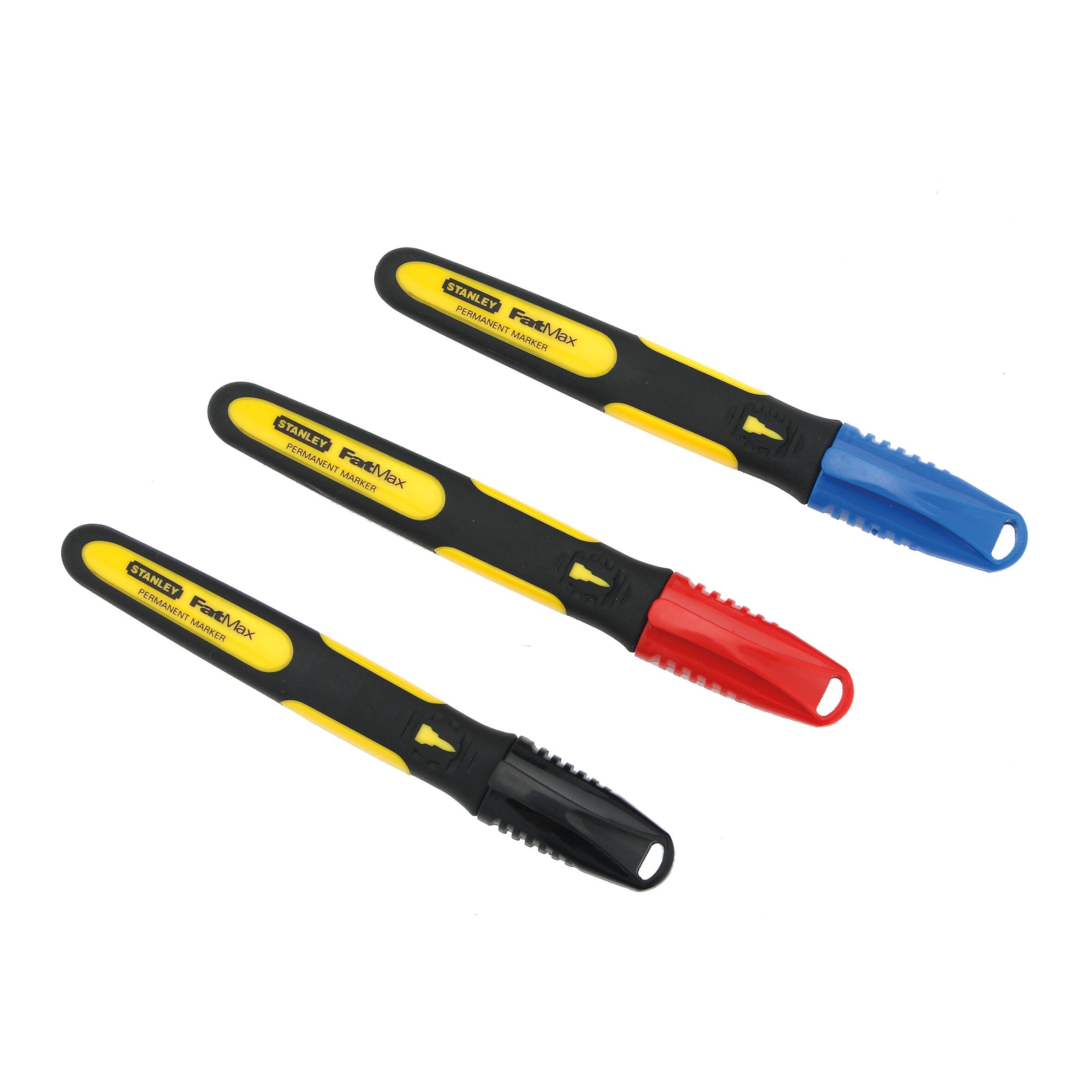 Confezione 3 pennarelli FATMAX indelebili, punta fine, inchiostro nero, blu e rosso. Per marcare su cemento, tegole, utensili, legno, metallo, tubature. Impugnatura e tappo anti scivolo, corpo bi-material. Indelebile sulla maggior parte delle superfici, inchiostro resistente all'acqua ed olio.