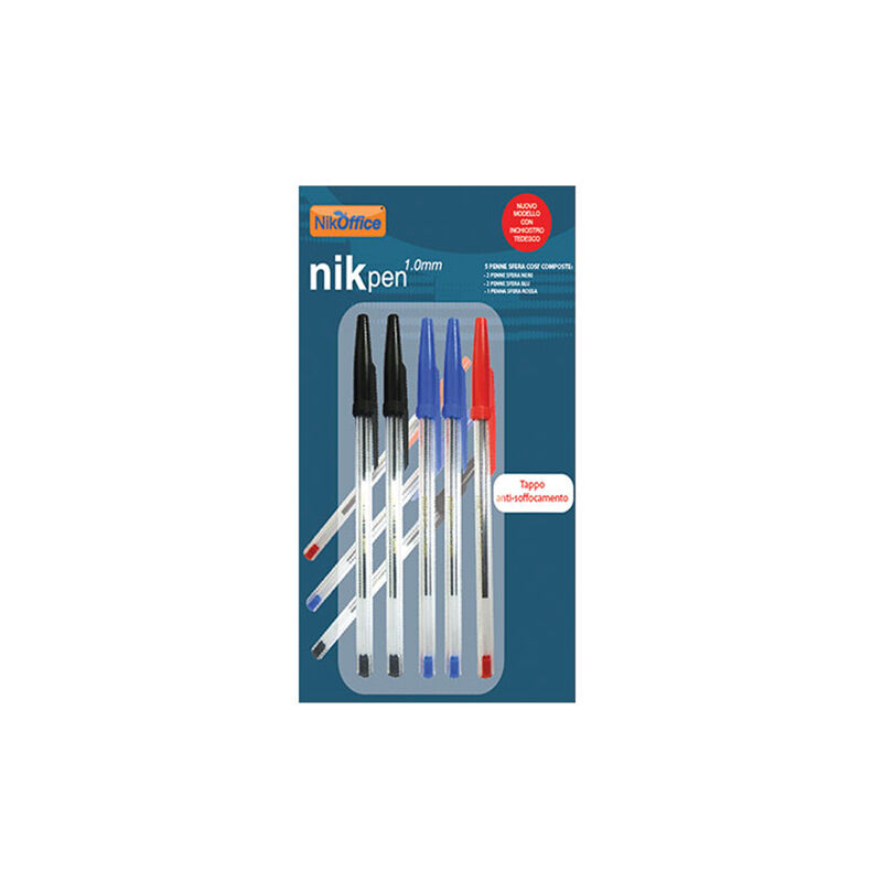 Blister composto da 5 penne a sfera Nikoffice. La confezione comprende: n.2 penne inchiostro nero n.2 penne inchiostro blu n. 1 penna inchiostro rosso