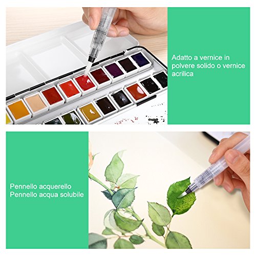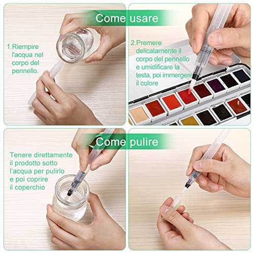 Facile da usare, basterà semplicemente svitare il pennello e aggiungere un pò di acqua al suo interno. Completo di una mini tavolozza su cui aggiungere i colori che desideriamo