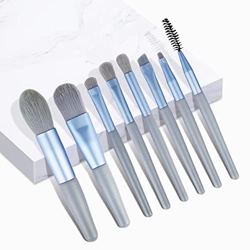 Set Pennelli Make Up, 8 Pezzi Pennelli Trucco Pennello Fondotinta Liquido Pennelli Trucco Professionale Pennello Correttore Occhiaie Kit Pennelli Ombretto Occhi (Blu + Custodia in Pelle)