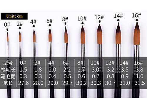 I pennelli sono disponibili nelle misure: #0, #2, #4, #6, #8, #10, #12. #14, #16, fornendo una buona gamma di pennellate e tecniche.