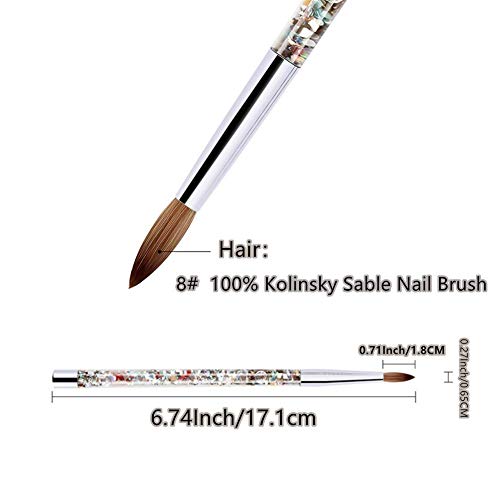 Pennello per unghie 100% Kolinsky Sable : Il pennello professionale per nail art kolinsky è più morbido e più flessibile da usare, ha un migliore assorbimento d'acqua rispetto alla normale spazzola per unghie in nylon e ad altri spazzolini per unghie di zibellino mescolati con nylon. Rende le tue unghie belle, ha una buona forma e fornisce una migliore colorazione, può essere utilizzato per tutti i tipi di nail art. Unisci il tuo stile, elegante e affascinante!