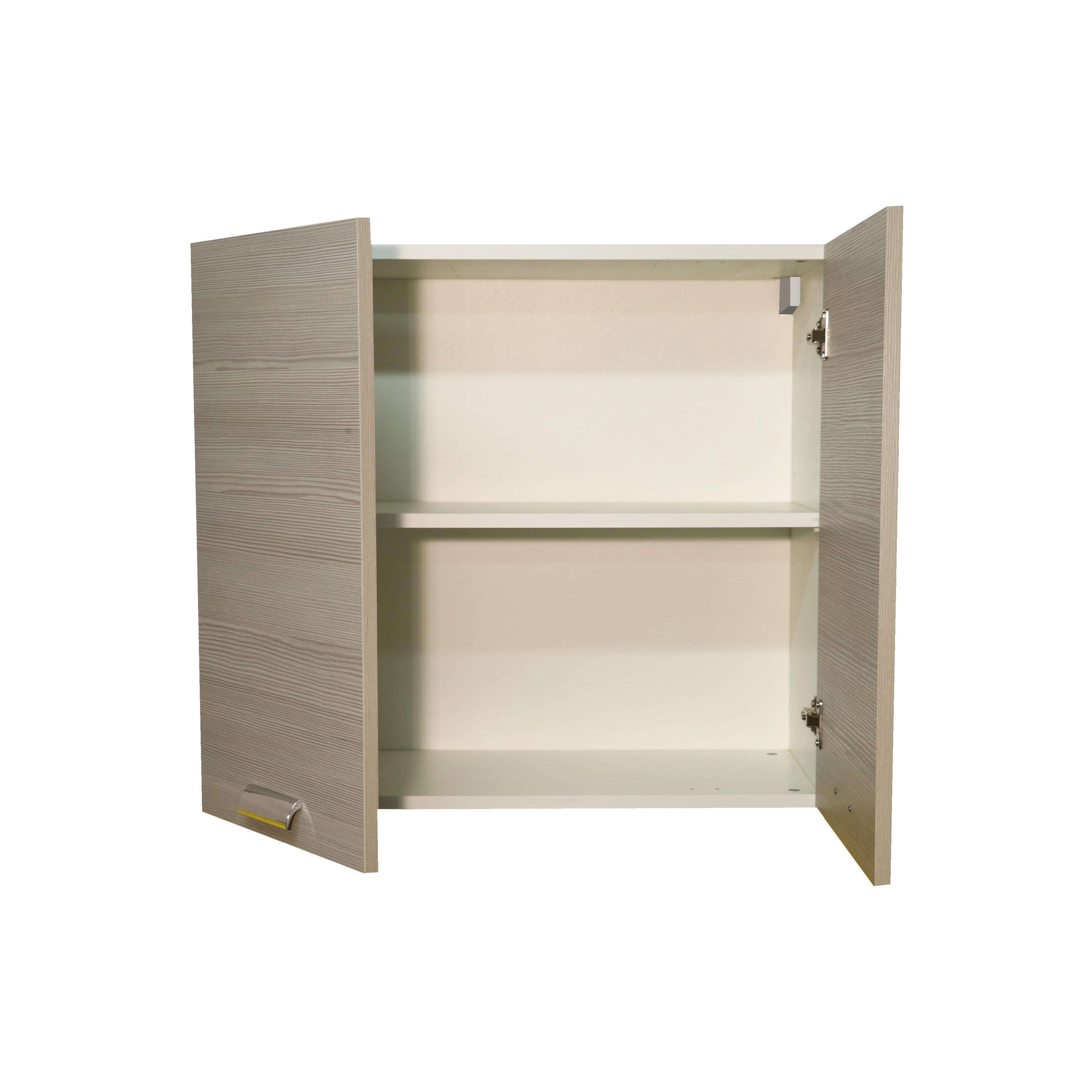SKY 80 A-2 Il pensile SKY 80A-2 è dotato di due ante a battente e un comodo ripiano regolabile in altezza, colore olmo grigio. Dimensioni: L 80 cm x P 35 cm x H 70 cm. Colli: n.1 in kit di montaggio. Peso: 17 Kg Istruzioni: pittografate e in italiano. Ferramenta: in dotazione. Materiale:struttura in nobilitato spessore 18 mm rivestito con carta melaminica da 120 gr di spessore colore bianco con finitura anti-graffio top-face, bordato stesso colore e finitura, ante in nobilitato spessore 18 mm colore Olmo grigio finitura Xilan, bordate stesso colore e finitura, colle poliuretaniche per resistere all'umidità e all'acqua, vista la loro funzione improntata prettamente all'esposizione dell'acqua stessa. Schiena: HDF stesso colore bianco del pensile con apposite asole per la fuoriuscita dei reggipensili a muro.Accessori: Cerniere in metallo dotate di sistema di montaggio “FAST", maniglie in ABS cromato lucido con interasso 96 mm, reggipensili regolabili, barre in ferro per appendere il pensile, viteria varia.