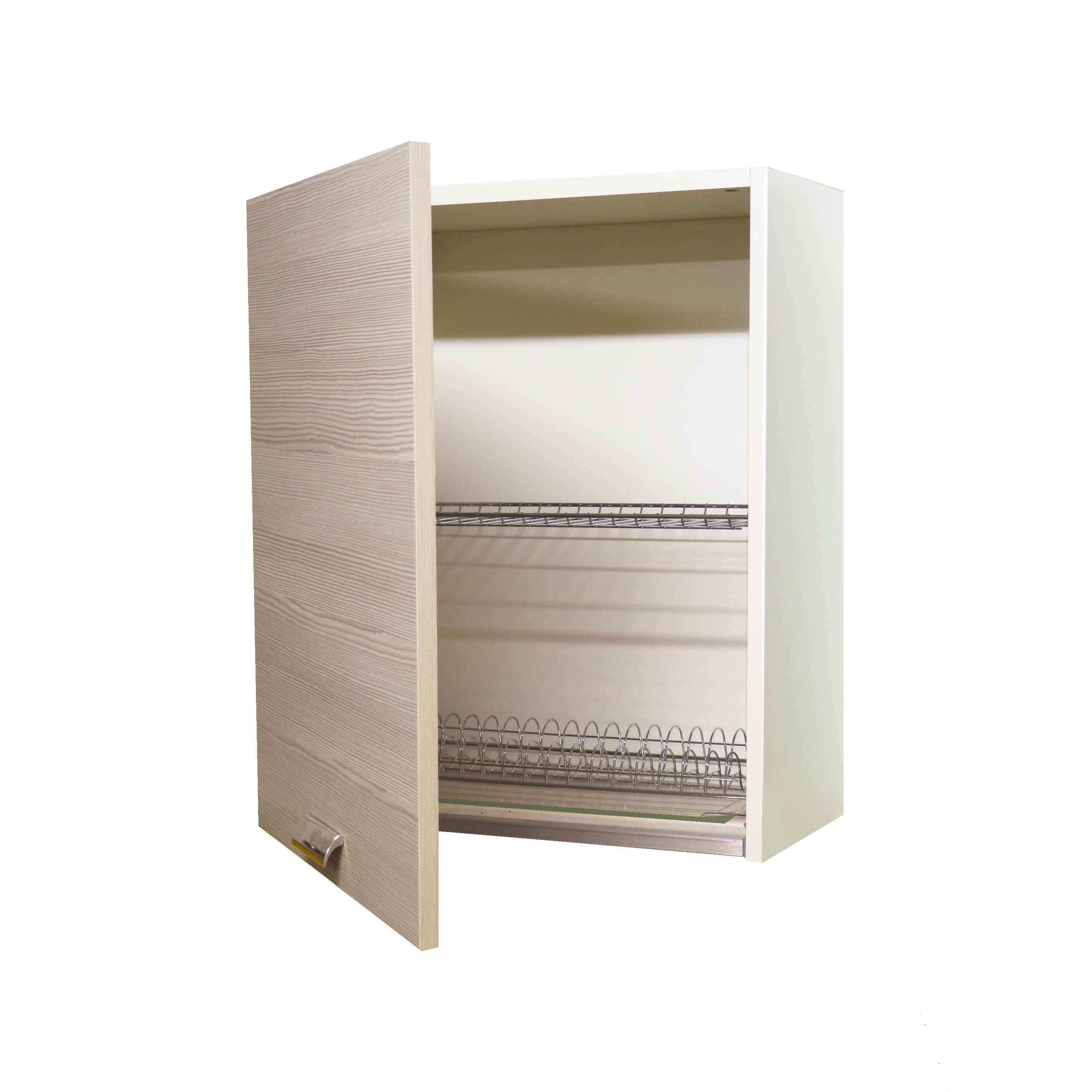 SKY 60-2 Il pensile SKY 60-2 è dotato di un'anta a battente e di uno scolapiatti interno completo di griglia portabicchieri e griglia scolapiatti da 60 cm in metallo cromato e vaschetta raccogligocce, colore olmo grigio. Dimensioni: L 60 cm x P 35 cm x H 70 cm. Colli: n.1 in kit di montaggio. Peso: 15 Kg Istruzioni: pittografate e in italiano. Ferramenta: in dotazione. Materiale:struttura in nobilitato spessore 18 mm rivestito con carta melaminica da 120 gr di spessore colore bianco con finitura anti-graffio top-face, bordato stesso colore e finitura, ante in nobilitato spessore 18 mm colore Olmo grigio finitura Xilan, bordate stesso colore e finitura, colle poliuretaniche per resistere all'umidità e all'acqua, vista la loro funzione improntata prettamente all'esposizione dell'acqua stessa.. Schiena: HDF stesso colore bianco del pensile con apposite asole per la fuoriuscita dei reggipensili a muro. Accessori: Cerniere in metallo dotate di sistema di montaggio “FAST", maniglie in ABS cromato lucido con interasso 96 mm, reggipensili regolabili, barre in ferro per appendere il pensile, viteria varia.