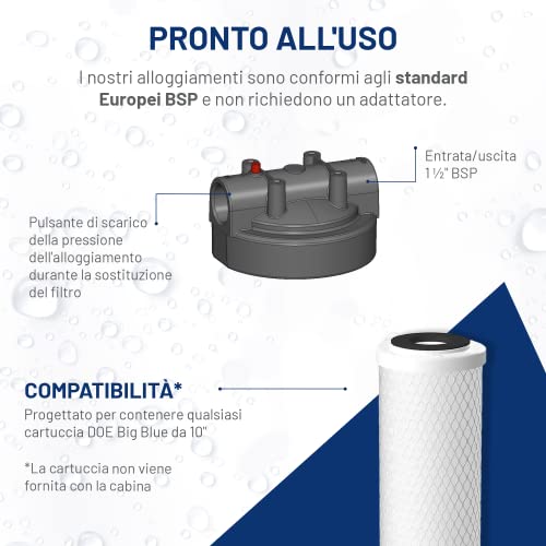 COMPATIBILE CON CARTUCCE BIG BLUE 10'' - Questo alloggiamento Big Blue è compatibile con cartucce Big Blue da 10''. È anche compatibile con una vasta gamma di agenti chimici e disponibile con pulsante di scarico pressione