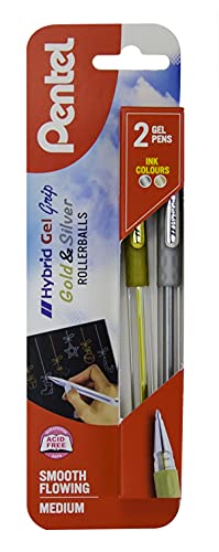 Pentel, penna gel a sfera Hybrid Gel Grip Rollerball, punta da 0,6 mm, tratto da 0,3 mm, nero. Confezione da 2 Gold & Silver