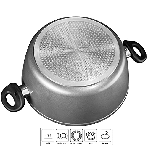 Adatto a tutti i piani cottura: utilizzabile su piani cottura a gas, in vetroceramica, a induzione ed elettrici. Adatto al forno fino a 180 °C, fondo extra forte, non si deforma, adatto all'induzione.