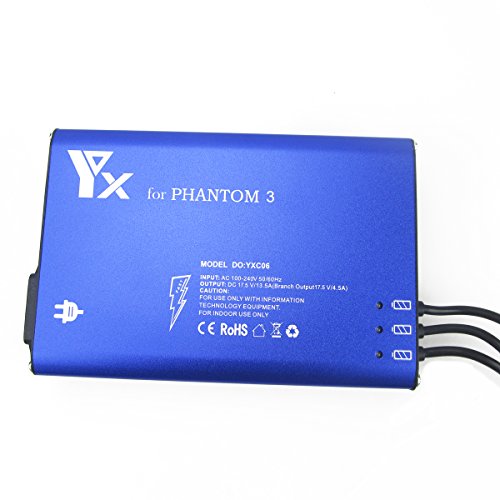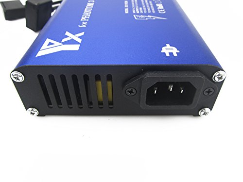 Carica completa Phantom 1 o 3 batterie in circa 80 minuti. Ingresso: 110-240 v, uscita: 17,5 V 12 A (17,5 A 4 A su ciascuna batteria)