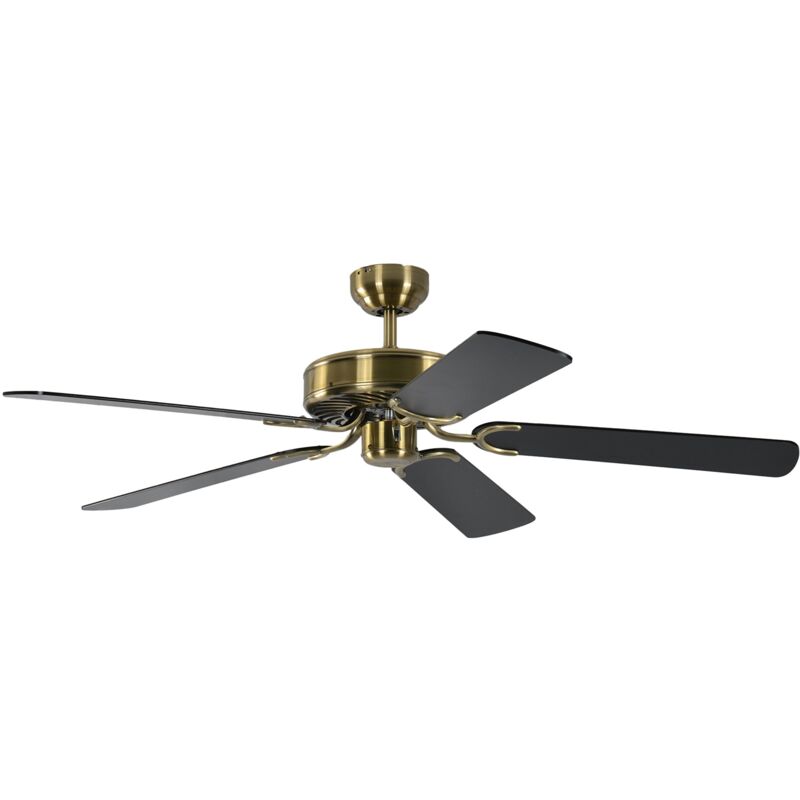 Ventilatore soffitto pepeo 1334201232_v2 potkuri. Classica esecuzione con pale reversibili con o senza decori a righe. Questo ventilatore senza luce si comanda con le catenelle, per essere abbinato anche ad un regolatore da parete o un telecomando. Inoltre il ventilatore e dotato di inversione del senso di rotazione delle pale, funzione particolarmente utile in inverno perché permette di abbattere l'aria calda che ristagna in alto con un conseguente risparmio sui costi di riscaldamento. Dati tecnici:diametro: 132 cm adatto ad ambienti fino a 25 metri quadrati. Motore: a 3 velocita. Colore ottone antico. Pale: 5 in colore nero reversibili con o senza righe di decoro. Inclinazione pale: 11°. Potenza watt: 58 - 40 - 26 a seconda della velocita di rotazione. Rotazione: 180 - 130 - 80 giri al minuto. Montabile anche senza asta. Distanza da soffitto a filo pale: 27 cm (20 cm se non viene montata l'asta). Distanza da soffitto a filo inferiore ventilatore: 33 cm (26 cm se non viene montata