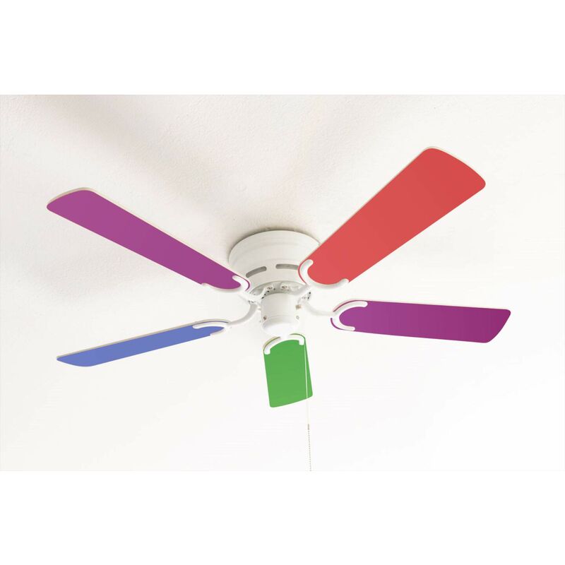 Descrizione Kisa Multicolor ventilatore a soffitto bianco ala colorata / colorata pastello incluso interruttore a tirare Dati tecnici 240 Volt/50 Hertz Diametro: 105 cm per ambienti fino a 15m² Colore ala: colorata / colorata pastello (doppia ottica) Colore dell'alloggiamento: bianco Angolo di inclinazione delle ali: 12° Rotazioni al minuto: max. 202 (regolabile in tre fasi) Consumo di potenza (watt): max. 44 watt Distanza soffitto alle lame: 15,0 cm (non accorciabile-estensibile) Distanza soffitto all'alloggiamento dell'interruttore di estremità inferiore: 19,0 cm Peso: 5,7 kg Ventilatore è commutabile tramite interruttore a tirare in dotazione non utilizzabile per il controllo remoto upgradeable per l'interruttore a muro (opzionale) Flusso d'aria 5220 m³/h - equivalente a 2m³/min/watt Livello di rumore 52 db(A) al livello più alto.