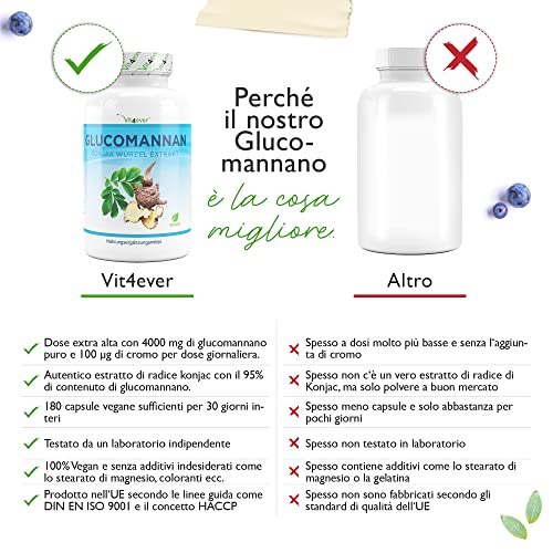 OTTIMO PREZZO PERFORMANCE: 180 capsule di glucomannano ad alto dosaggio. Una porzione giornaliera di 6 capsule contiene 4000 mg di glucomannano puro, che deriva da 4200 mg di vero estratto di radice konjac con il 95% di contenuto di glucomannano. Inoltre, contiene 100 μg di cromo, che è nella forma altamente biodisponibile del picolinato di cromo.