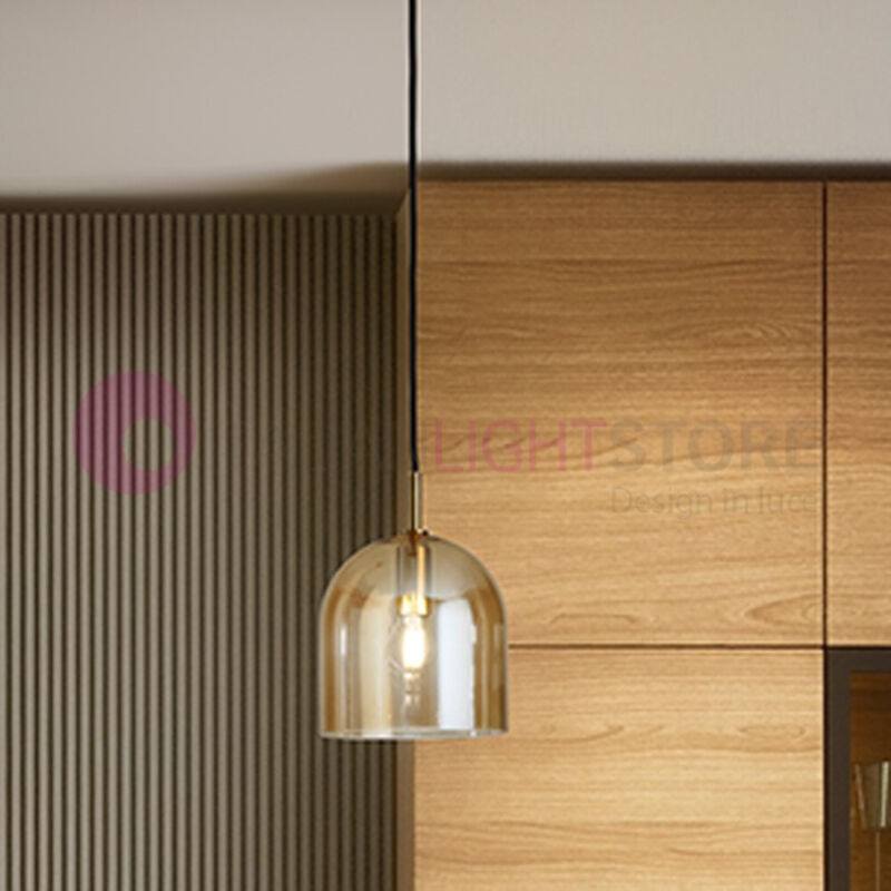 Collezione Coro LA SOSPENSIONE CHE ILLUMINA CON COLORE Sospensione in vetro e metallo, con paralume in vetro in finitura ambra che dona un'atmosfera calda ed accogliente.. La sospensione ha un design elegante e moderno, perfetto per arredare con stile sia ambienti domestici che commerciali.