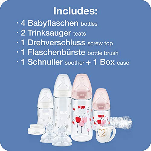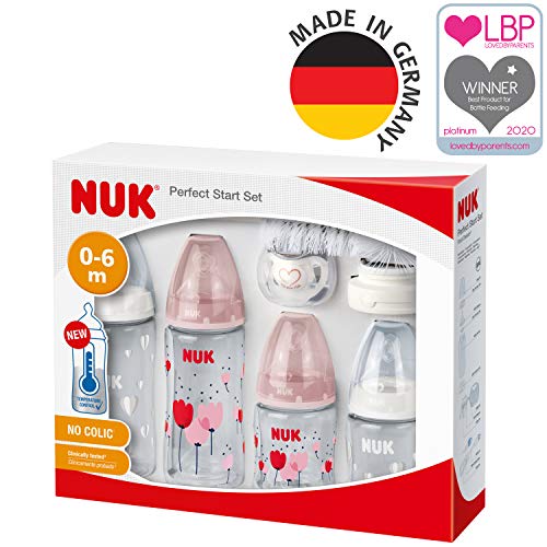 Nuk Perfect Start First Choice+ Set Biberon 0-18 Mesi 4 X Biberon con Controllo Temperature, Ciuccio, Scovolino Bottiglie + Sfiato Anti-Coliche senza Bpa Rosa (Bambina) 10 Pezi