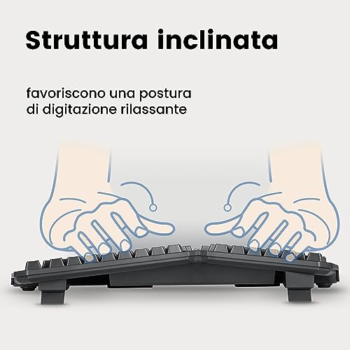 TASTIERA COMPATTA SPLIT - Tastiera ergonomica compatta con design Split-Key con tasti curvi e inclinati. Favorisce una posizione naturale del braccio e della mano durante la digitazione, riducendo al minimo le possibilità di RSI o di sindrome del tunnel carpale.