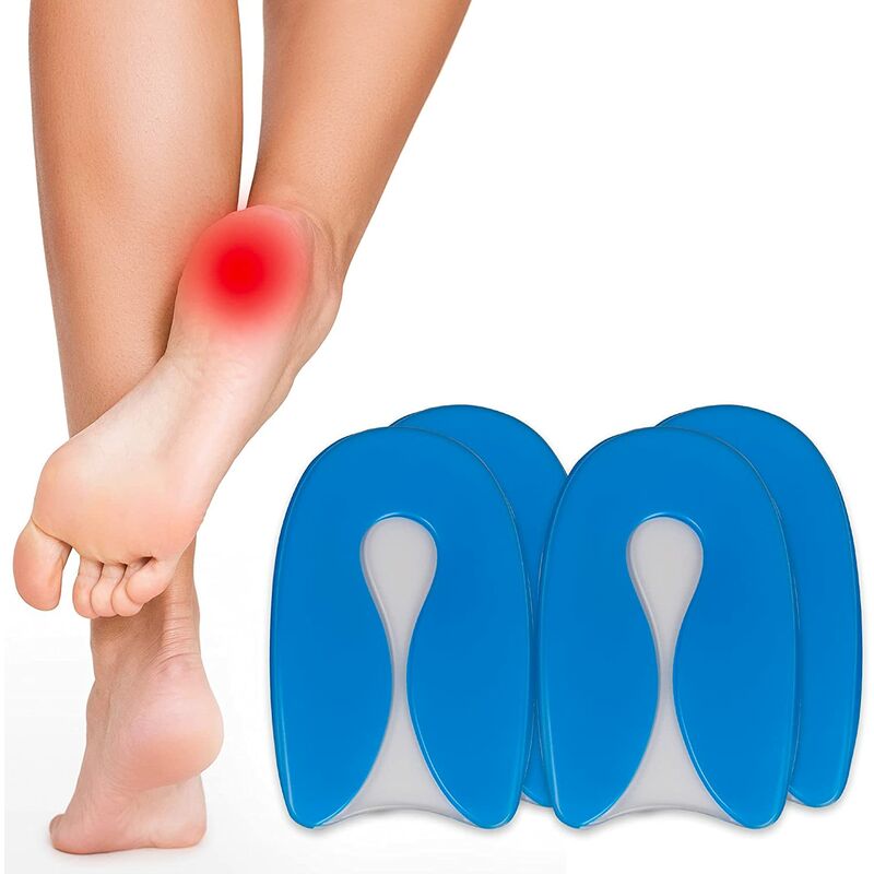 Cuscino per il tallone Aiuta i tuoi piedi a rilassarsi Prenditi cura dei tuoi piedi Goditi morbidezza e comfort Il silicone ha una buona tenacità e non si deforma, e lo strato elastico altamente elastico allevia i legamenti pressione Design perimetrale curvo Smorzamento e decompressione per una camminata più confortevole La parte blu è più morbida Distribuisce la pressione del tallone >