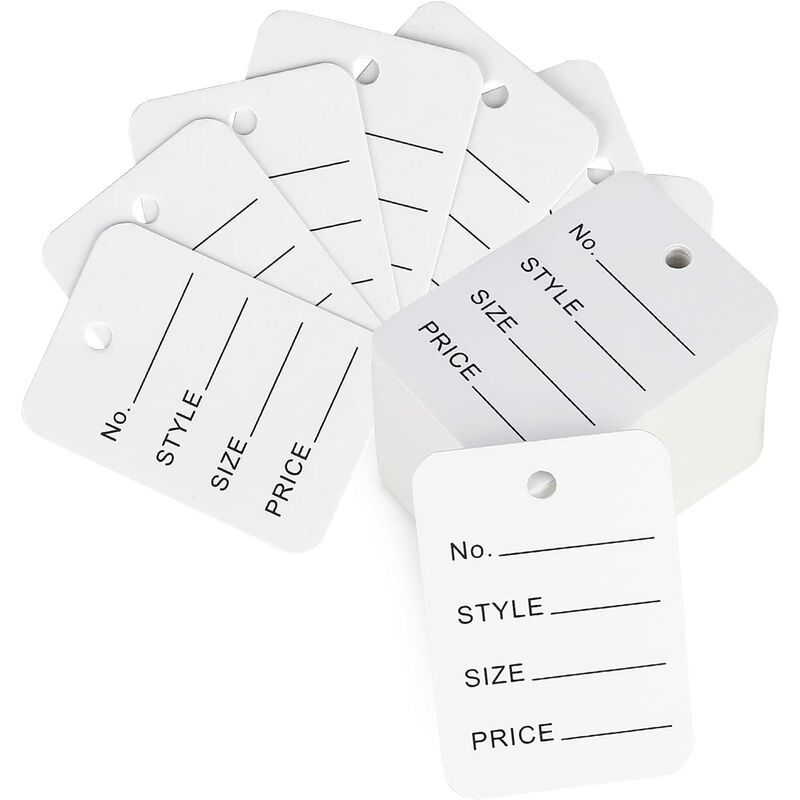 La dimensione dell'etichetta è di 3,5 cm x 5 cm e il suo foro è di 0,3 cm Realizzato in cartoncino di alta qualità, liscio su cui scrivere Questi cartellini dei prezzi possono essere utilizzati per contrassegnare vestiti, scarpe, cappelli o gioielli Stampati con la parola N./Stile/Taglia/Prezzo, i clienti possono inserire chiaramente i dettagli del prodotto Riceverai una confezione da 500 bianchi cartellini dei prezzi, sufficienti per soddisfare le tue esigenze