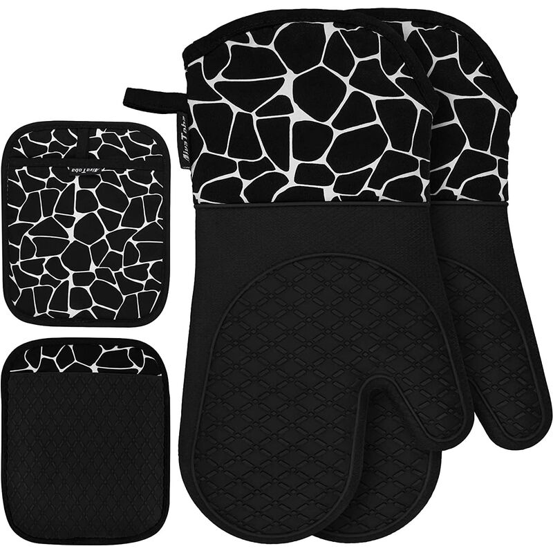Resistente al calore fino a 300 ℃ - I guanti da forno e la presina sono realizzati in cotone 100% poliestere e rivestiti in silicone, resistenti al calore fino a 570/300 ℃. Questo protegge efficacemente le tue mani dalle ustioni 【Protezione lunga dell'avambraccio】I polsini da 5,1 pollici, così lunghi, proteggono gli avambracci dalle ustioni quando si maneggiano oggetti caldi. I guanti da forno offrono un'ottima protezione contro il calore estremamente elevato e proteggono la punta delle dita, i polsi e gli avambracci 【Impugnatura e struttura antiscivolo】 La struttura in silicone sulla superficie non garantisce solo una migliore resistenza al calore, ma anche una presa stabile e antiscivolo su tutti gli utensili da cucina. Ti dà una presa antiscivolo quando raggiungi piastre pesanti, proteggi le tue mani! 【Facile da lavare e conservare】Facile da pulire e conservare! Lavare in lavatrice in acqua fredda e asciugare in asciugatrice a bassa temperatura (si consiglia il lavaggio a mano). I