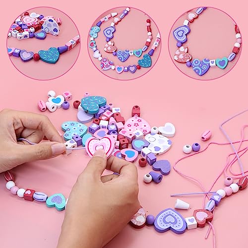 【Perline per Braccialetti Bambini】Il set di perline di legno artigianale contiene più di 120 perline in sette colori e forme diversi, tra cui cuori di perline di legno, perline di legno e altri. 4 corde e scatola di legno.