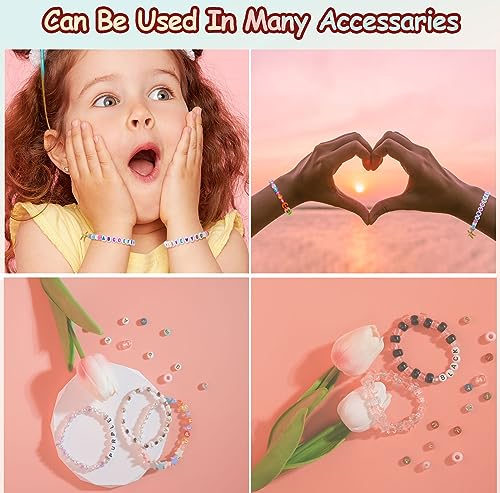 Perline e accessori: il set contiene 200 lettere bianche e nere, 200 lettere bianche colorate, 200 lettere colorate, 200 lettere colorate, 200 lettere colorate trasparenti, 200 lettere dorate, 200 lettere dorate, 200 lettere di cioccolato, 50 numeri, 50 cuori, 30 fibbie in metallo, 30 pezzi 0 passanti dorati E, 20 perline distanziatrici, 20 perline a stella, 10 chiusure a moschettone, 1 rotolo di cordini elastici da 0,8 mm di diametro, con mini forbici