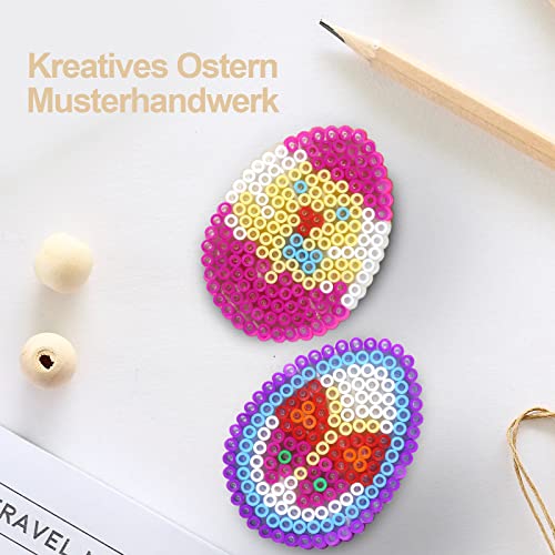 Set di piastre di perline da stirare: il set di perline contiene perline da stirare in 10 colori, 2 piastre per penne (1 quadrata, 1 forma di uovo), 8 motivi di carta pasquale, 4 carta da stirare, 1 pinzetta, 8 cordini colorati, nastro biadesivo per il fissaggio, alcuni piccoli accessori.