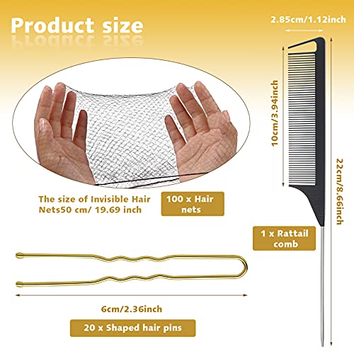 Set di 121 Perni Retina Capelli, 100 Retine Elastiche Invisibili per Capelli 20 Perni a Forma U Reti per Capelli Castano Chiaro Copricapi in Rete Forcine con Pettine Coda Nera per Donna