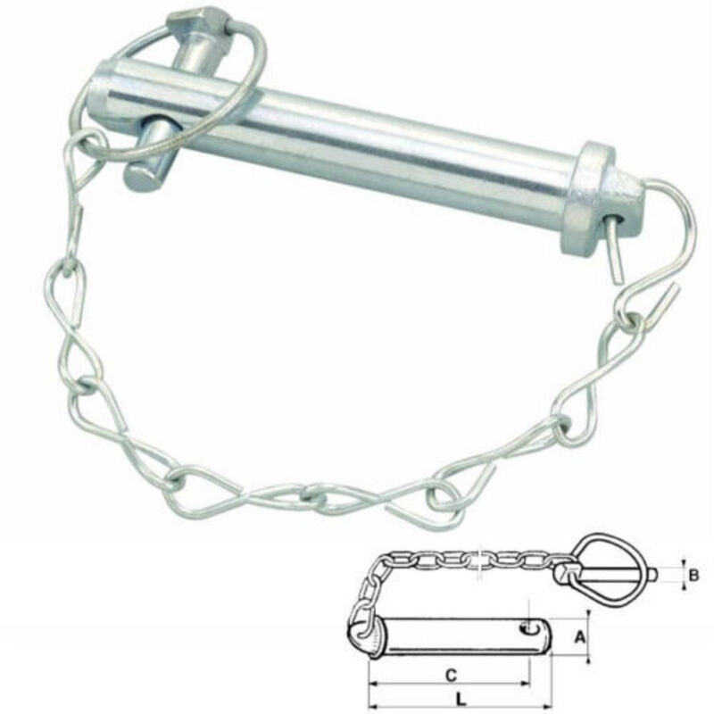 PERNO PER TERZO PUNTO COMPLETO DI CATENA E SPINA SCATTO MM 25X120 Perno per terzo punto completo di catena e spina a scatto. Misure in mm. (vedere in foto per le lettere): A: 25 B: 11 C: 100 L: 120