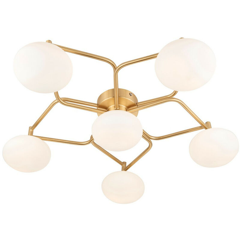 Merano Pesaro Lampada decorativa a filo soffitto, lastra in ottone satinato, vetro opalino opaco | Finitura: ottone satinato, vetro opalino opaco | Materiale: acciaio, vetro | Classificazione IP: IP20 | Proiezione: 15,5 cm | Diametro: 70 cm | Tipo di lampada: G9 | N. di lampade: 6 | Lampadina inclusa: No | Dimmerabile: Sì - Lampadina dimmerabile richiesta | Peso: 2,62 | Potenza (max): 3W LED