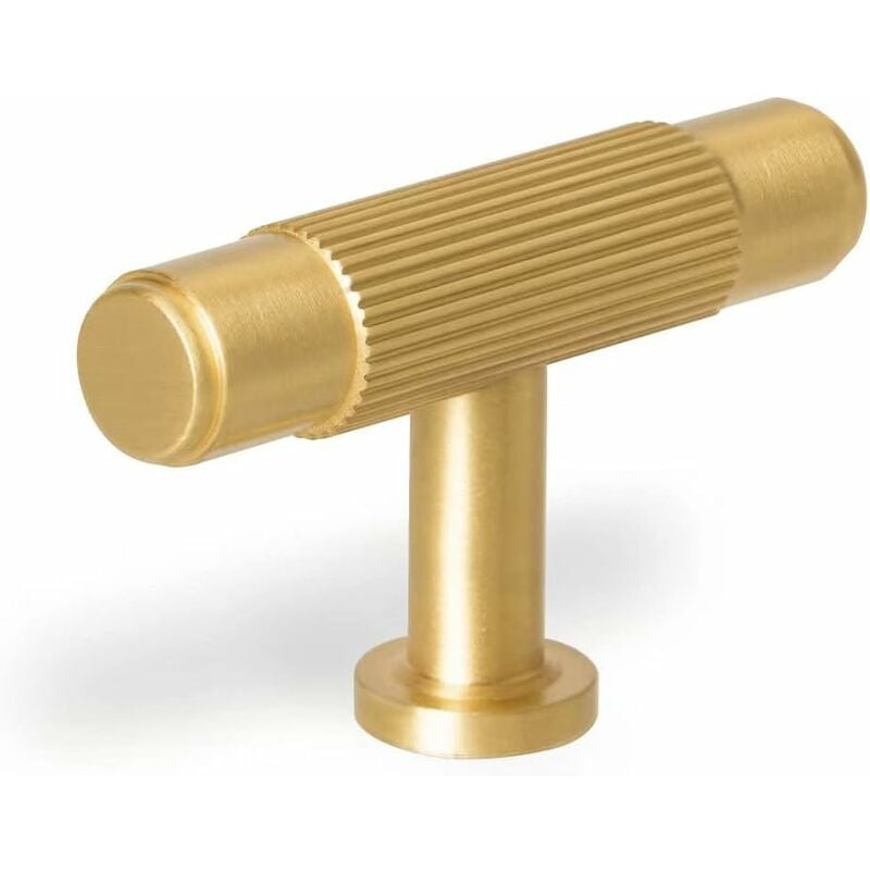 Set di 6 pomelli per mobili lunghezza 52 mm, altezza 32 mm, forniti con viti per una facile installazione. Le maniglie dell'armadio in oro spazzolato sono realizzate in ottone di alta qualità, resistenti, antiruggine e più durevoli. Design classico a forma di T, adatto a tutti i tipi di mobili, come armadi, cassetti, cassettiere, ecc.