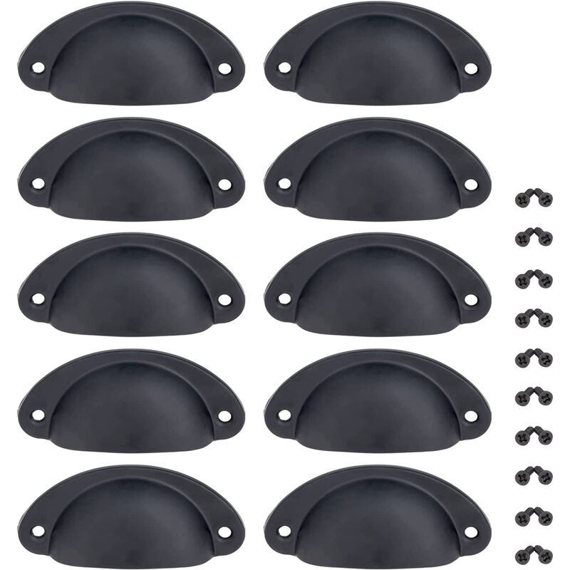 Materiale: Ferro Colore: Nero Dimensioni: 82 x 35 mm Incluso: 10 x Maniglie, 20 x Viti Classica maniglia retrò, semplice e comoda, facile da installare Ideale per sostituire le maniglie dei mobili danneggiate. Decora e rinfresca armadi, cassetti e altri mobili. Si prega di misurare le dimensioni necessarie prima di effettuare un ordine.