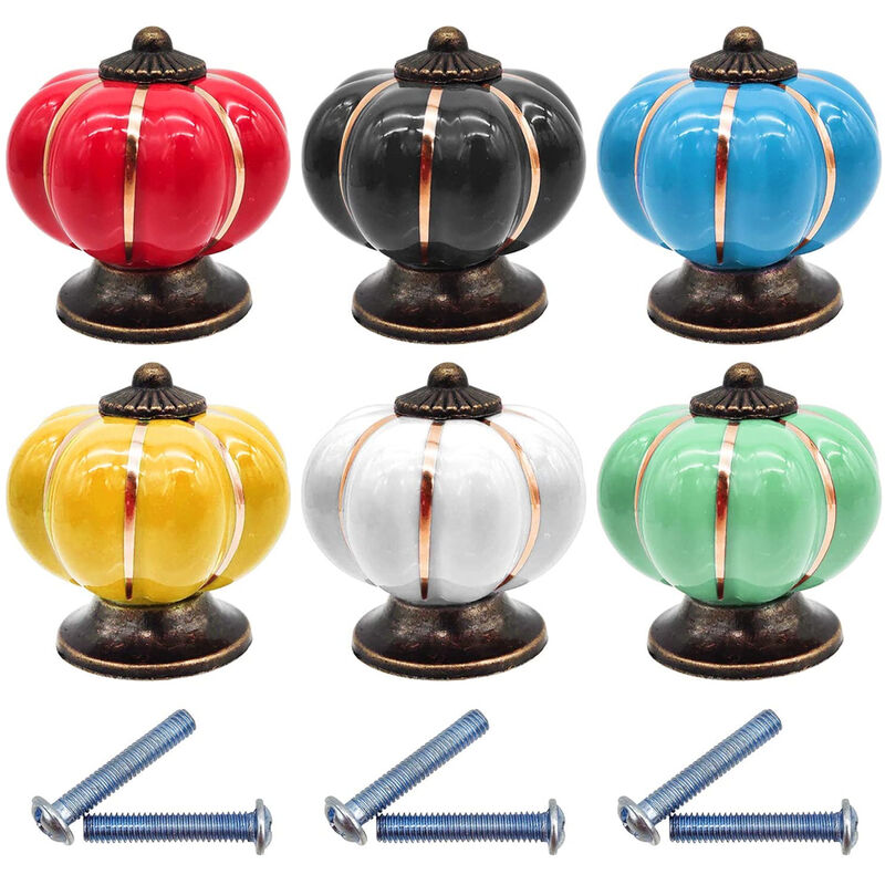 •Un set di maniglie in ceramica colorata contiene 6 pomelli e 6 viti. •Ci sono 6 colori, vale a dire rosso, giallo, blu, verde, nero e bianco. •I suoi colori vivaci sono molto adatti per rinnovare i mobili. •Questa maniglia della porta ha la forma della zucca e ha un buon effetto decorativo. •La maniglia circolare può fornire un buon senso di utilizzo, bello e pratico. •Può essere utilizzato per armadi, toelette, cassetti, ecc.