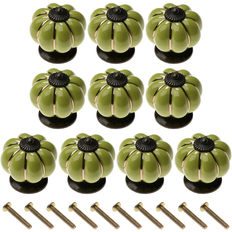 Contenuto della confezione: Il set include 10 maniglie verdi e 10 viti. Le dimensioni di ogni maniglia sono 40 × 40 × 40 mm. Aspetto unico: Questa maniglia dell'armadio ha una forma di zucca. Le linee dorate lo rendono ancora più unico. Materiali di alta qualità: Realizzato in ceramica di alta qualità. La base in lega di zinco è robusta e durevole. Ampia gamma di applicazioni: Le maniglie vintage sono adatte a tutti i tipi di mobili. Come porte, armadi, cassetti, cassettiere, ecc.