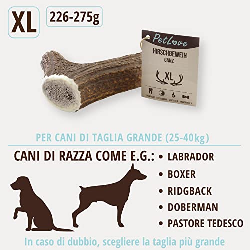 PetLove Corno di cervo per Cani, Carna Intere (XL 226-275g) • Osso da Masticare per Cani • Bastone Snack per Cani • Giocattolo per Cani da Masticare Lunga Durata