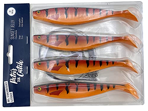 PetrisCatch - Set di 4 esche morbide in gomma Sunset | 15 cm | UV attivo | 4 terminali in acciaio | per luccio, luccioperca, pesce persico e pesce