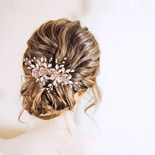Pettine per Capelli da Sposa, DIFCUL Accessori per Capelli da Sposa con Fiore e Cristalli per Altre Occasioni Importanti Come Feste di Nozze (Oro Rosa)