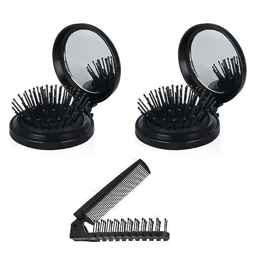 Pettini Pieghevoli da Viaggio Mini Spazzola per Capelli Pieghevoli con Specchio 2 Pezzi,Mini Spazzola per Capelli Pieghevoli con Specchio, Spazzola Rotonda Pieghevole Portatile