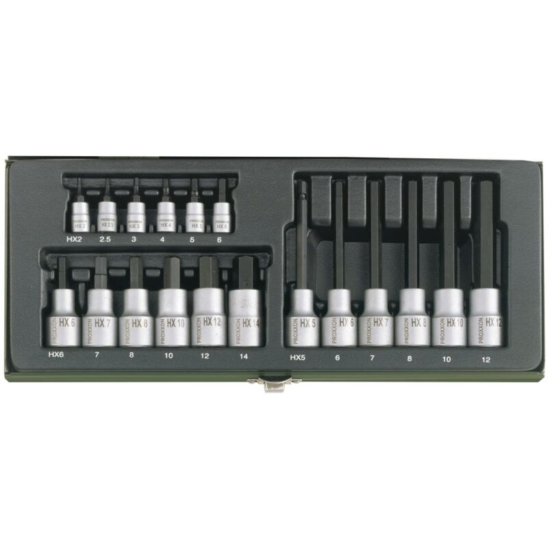La chiave della presa con dispiedosi esagonale da Proxxon è disponibile nella robusta scatola di acciaio robusta e verniciata a polvere. Offre inserti per cacciavite per unità 1/4 e 1/2. Per 1/4 di azionamento quadrato (6,3 mm) e coppie di serraggio fino a 25 Nm. Gr. 2 - 6 mm. Per 1/2 Drive Square (12,5 mm) e Torchi di serraggio di 25 - 210 Nm: gr. 6 - 14 mm (versione corta 55 mm) e gr. 5 - 12 (versione lunga 100 mm). Una tabella per i fili di M 1,6 - M 24 con torri di serraggio è fissata in modo permanente nel coperchio. I valori per la durezza e la coppia massima sono meglio richiesti rispetto a DIN / ISO. Il livello dimensionale è all'interno delle tolleranze approvate. Con inserti stampi indistruttibili resistenti alla torsione realizzati in polipropilene spruzzato. Fest d'acido resistente agli olio e facile da pulire. Con la marcatura permanentemente leggibile per tutte le larghezze chiave. Sono anche adatti per l'inserimento in cassetti delle auto da officina comuni. Inserti