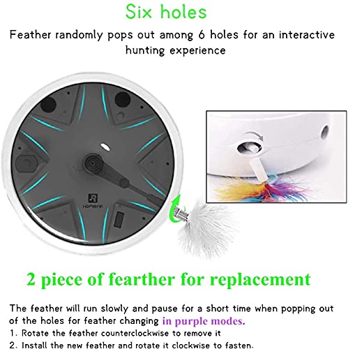 Giocattolo Intelligente per Gatti Completamente Automatico: Stai ancora usando un semplice bastone teaser per giocare con il gatto? O non hai abbastanza tempo per accompagnare il tuo gatto? Giochi gatto automatico ha sei fori in totale, e le piume sporgeranno casualmente da diversi fori, che possono attirare l'interesse e l'attenzione del gatto, stimolare l'istinto di caccia del gatto e giocare con il gatto per te. In questo modo, il gatto non danneggerà i mobili e può ridurre le perdite.