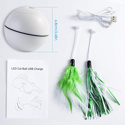 Petyoung - Palla interattiva a LED per gatti, ricaricabile, a 360 gradi, con piume staccabili e nastro colorato (bianco)