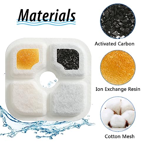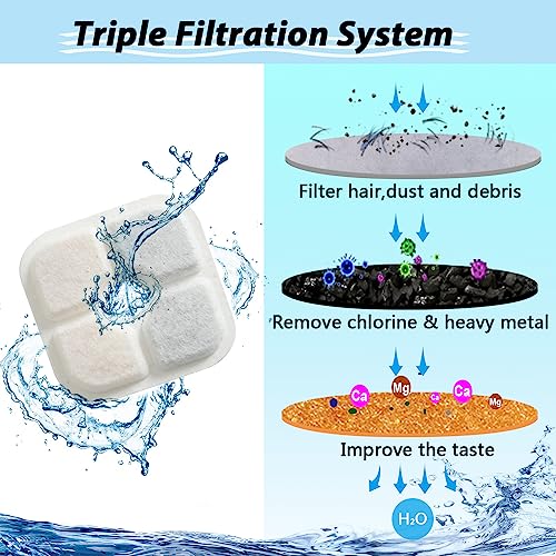 【Filtro acqua a tripla azione】Filtri fontana gatto per acqua a tripla azione è composto da una rete di cotone,carbone attivo e resina a scambio ionico.La rete di cotone filtra i detriti,il carbone attivo rimuove gli odori e la resina a scambio ionico addolcisce l'acqua.Filtri fontanella efficacemente capelli,metalli pesanti e impurità, mantiene l'acqua fresca e migliora il gusto dell'acqua.
