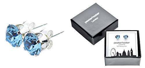 pewterhooter Classic Collection - Orecchini a perno in argento sterling con cristalli. Realizzato con scintillanti pietre di cristallo blu acquamarina. Gli orecchini misurano 6 mm x 6 mm. Impostazione in argento Sterling 925 con timbro e timbro (adatto solo per orecchie forate). Ipoallergenico e senza nichel per orecchie sensibili. Confezione regalo.