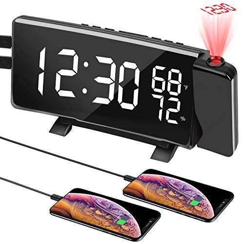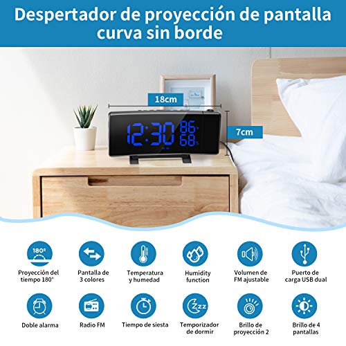 PEYOU - Sveglia digitale proiettore, radio FM, proiettore da soffitto con allarmi doppi, schermo LED da 7", 3 luminosità, misurazione della temperatura e dell'umidità, porta USB, 12/24 ore, snooze