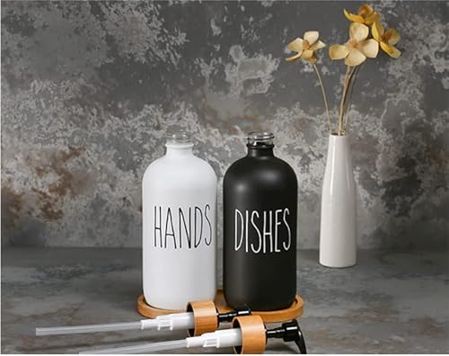 2 Pezzi 500ml Dispenser Sapone di Vetro, Bottiglie Dosatore Liquido con Pompa e con Vassoio di Bambù,Dispenser Sapone Schiuma Set per sapone liquido per Decorazioni per Lavanderia(Nero+bianco)