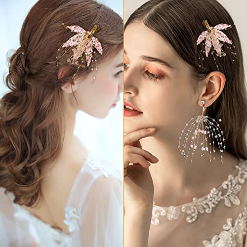 【Design elegante e unico】 I fermagli da sposa per capelli sono punteggiati di paillettes rosa, perline di cristallo e perline di metallo, hanno un aspetto scintillante, carino e affascinante. La clip a coccodrillo sul retro della foglia d'acero può adattarsi perfettamente alla tua pettinatura e può essere facilmente fissata sui capelli. È molto adatto per capelli lunghi, capelli corti e capelli fini.