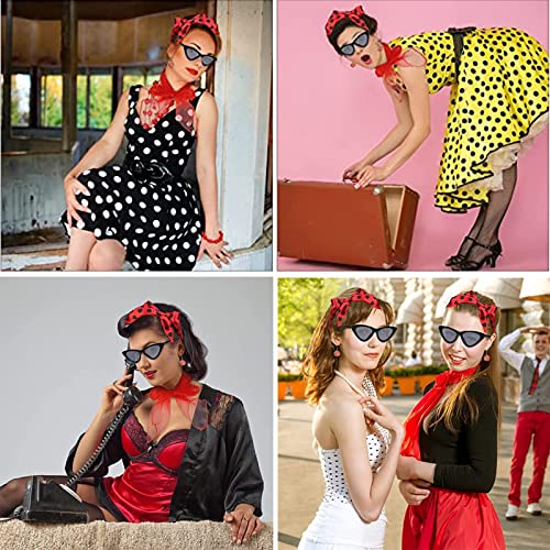 9 Pezzi Set di Accessori Per Costume Da Donna Anni '50, Sciarpa in Chiffon a Pois Bandana Tie Orecchini a Fascia Retro Cat Eye Eglasses, Per Festa Compleanno Carnevale e Laurea (Rosso)