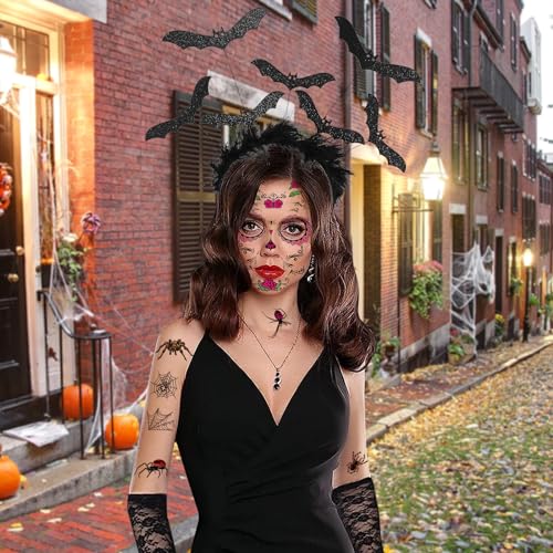Set costume di Halloween: il set include 1 fascia per capelli a pipistrello, 1 accessorio per capelli a pipistrello, 2 tatuaggi temporanei per il viso, 10 adesivi per tatuaggi, la combinazione perfetta per soddisfare le esigenze dei bambini e brillare alla festa.
