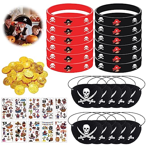 Pacchetto festa pirata: il pacchetto contiene un totale di 58 pezzi di articoli per la festa pirata, tra cui 12 * patch occhio pirata, contiene 12 * braccialetti in silicone pirata (2 colori), 10 fogli di adesivi temporanei tatuaggio pirata, 24 monete d'oro di plastica.